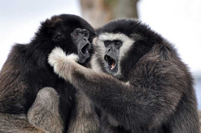 Гиббоны-очень вокальные животные, и семья обычно поет свою территориальную песню утром и в другое время дня. Пение должно объявить о своих границах другим группам гиббонов поблизости и создать социальную связь с другими. В то же время эти громкие звуки также являются реакцией на определенные события, такие как поиск пищи и встреча с соседями. В то время как в иных случаях гиббоны используют свои звуки, чтобы предупредить других о хищниках поблизости. Женские звуки более низкие по частоте, чем мужские.