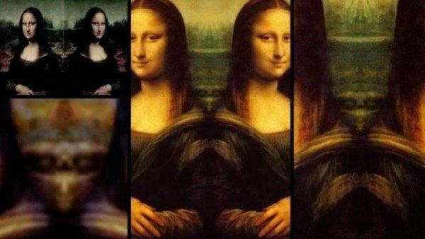 Иллюстрация Леонардо да Винчи, оставляющая скрытую информацию в его творчестве, взята из одной из его самых известных картин. При размещении двух зеркальных изображений Моны Лизы рядом друг с другом лицо инопланетянина становится видимым.
