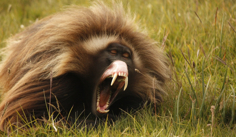 Этот вид бабуинов является не только одним из самых опасных травоядных и опасных обезьян, но и редчайшими обезьянами в мире. Выглядит как помесь льва и обезьяны, это один из трех эндемичных млекопитающих в Эфиопии. Бабуин Гелада большой и крепкий, а самцы имеют длинную тяжелую накидку из волос на спине. Эти бабуины живут в сложном многоуровневом обществе, которое состоит из различных групп. Это включает в себя группу от одной до двенадцати самок, их детенышей и от одного до четырех самцов, или все мужские единицы от двух до пятнадцати самцов. Бабуины Гелада строго вегетарианцы, и 90% рациона приматов состоит из травы, что делает их единственной травоядной обезьяной в мире. Несмотря на это, павианы имеют пугающе большие клыки. Это зубы, которые они используют, чтобы нанести серьезные повреждения, даже не стараясь. Когда им угрожают, бабуины откидывают назад свои верхние губы и десны, чтобы показать свои страшные зубы. Всегда лучше не приближаться и не угрожать им, ощущать укусы от этих зубов не так уж приятно.