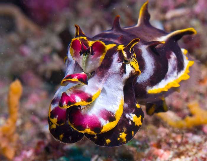 Здесь вы смотрите на единственную ядовитую каракатицу в мире, которая может вызвать серьезные проблемы, если ее съесть. В то время как для большинства головоногих моллюсков характерна способность менять цвет, яркие каракатицы делают это в целях апосематизма. Основной цвет этого головоногого моллюска на самом деле темно-коричневый с накладывающимися узорами белого и желтого цветов. Будучи мастером изменения цвета и маскировки, каракатица может быстро изменить свой цвет. Яркая окраска — это форма предупреждения хищникам о том, что они ядовиты. В то же время они также используют изменение цвета как часть общения, ритуалов спаривания и ловли добычи. Расписные каракатицы — медленные пловцы, и они не могут плавать очень долго. Вместо того чтобы плавать, они предпочитают ходить по морскому дну. Как часть повседневной жизни, эти каракатицы демонстрируют свой набор цветов, сталкиваясь с хищниками, когда они гуляют. Это предупреждение часто срабатывает, но есть также некоторые голодные хищники, которые иногда игнорируют знаки, такие как более крупные рыбы и тюлени. Читайте также:
