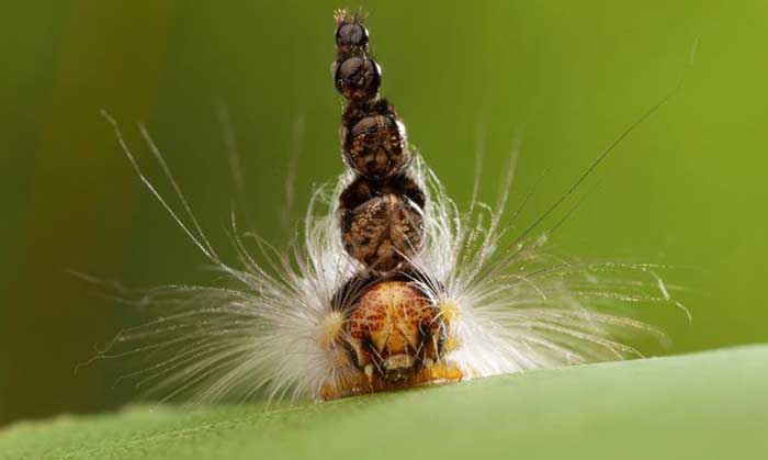 У безумной шляпницы тело от коричневого до желтого цвета с небольшими черными отметинами, которые помогают им сливаться со стволами эвкалиптов. Гусеницы должны регулярно сбрасывать свой экзоскелет, чтобы расти, и безумные шляпники делают то же самое. Уникальность этих странных гусениц в том, что они не выбрасывают свои пустые головные оболочки. После четвертой линьки безумный шляпник начинает укладывать шляпу на макушку своей головы. Этот вид линяет до 13 раз, и голова становится больше после каждой линьки. Эти шляпы не просто для шоу, гусеницы на самом деле используют этот причудливый головной убор, чтобы отгонять хищников. Они делают это, энергично мотая головами, чтобы у нападающих не было возможности съесть их. В то же время эти шляпы также спасают им жизнь, когда более крупные хищники, такие как птицы или ящерицы, хотят их съесть. Их естественными хищниками являются птицы, прыгающие пауки, кружевницы, паразитические мухи и осы, рептилии и вонючие клопы. В большинстве случаев эти хищники получат только полный рот шляпок, пока гусеницы остаются живыми. Шляпы также делают безумного шляпника более крупным, что более опасно для хищников, таких как прыгающие пауки. С другой стороны, вы можете видеть, что эти гусеницы покрыты очень зудящими и раздражающими шипами. Прикасаться к ним было бы ошибкой, потому что волосы могут жалить как других животных, так и людей. В случае, если вы их увидите, лучше не поднимать их, чтобы осмотреть. Читайте также: