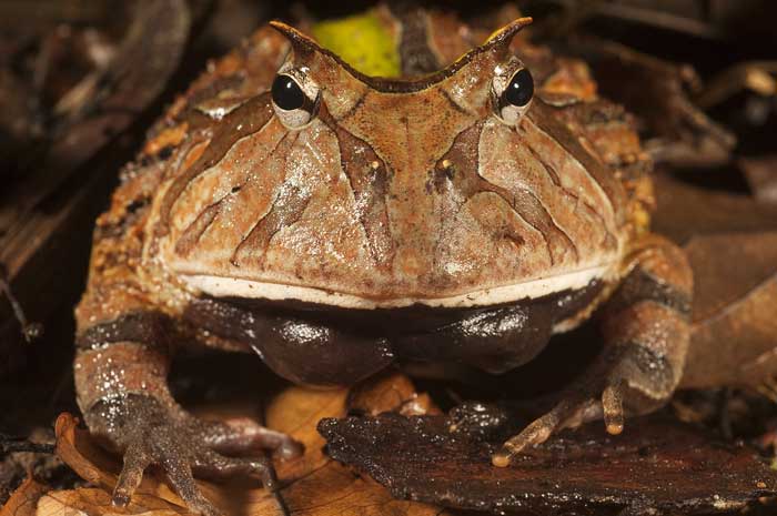 Длина: 20 сантиметров При таких размерах эта лягушка может удобно сидеть в довольно большом чайном блюдце. Амазонские рогатки водятся в пресноводных болотах и бассейнах по всей Амазонке от Колумбии до Бразилии. Как одна из самых крупных лягушек болот, этот вид не привередлив, когда дело доходит до того, что они едят. Поскольку они также являются хищниками из засады, они часто прячутся под подстилкой из листьев или лесным субстратом, чтобы дождаться добычи. Как только появится еда поменьше, они выскочат из укрытия и проглотят бедняжку целиком. Кроме того, благодаря острым зубам лягушки могут надежно запереть добычу, чтобы обеспечить нулевые шансы на побег. Сочетание аппетита, исключительно широких ртов, острых зубов и сильных челюстей принесло этим лягушкам еще одно прозвище “Лягушки Пакман”. Лягушка этого вида имеет коренастое округлое тело с бугристой кожей и короткими конечностями. У нее также есть роговидные выступы над глазами, которые напоминают черешки листьев. Эти проекции не только дают лягушкам их имена, но и дополнительное смешивание, помогающее им маскироваться. Будучи большими и сильными, рогатые лягушки также очень агрессивны и территориальны. Все они одиночки, и самцы агрессивно защищают свои территории любой ценой. Тем не менее, они все еще являются добычей крупных животных, таких как птицы и змеи, которые обитают в горах. Поскольку они уникальны, люди собирают их в дикой природе для торговли домашними животными. Помимо этого, разрушение среды обитания также является одной из основных причин, угрожающих их популяции в наши дни. Читайте также: