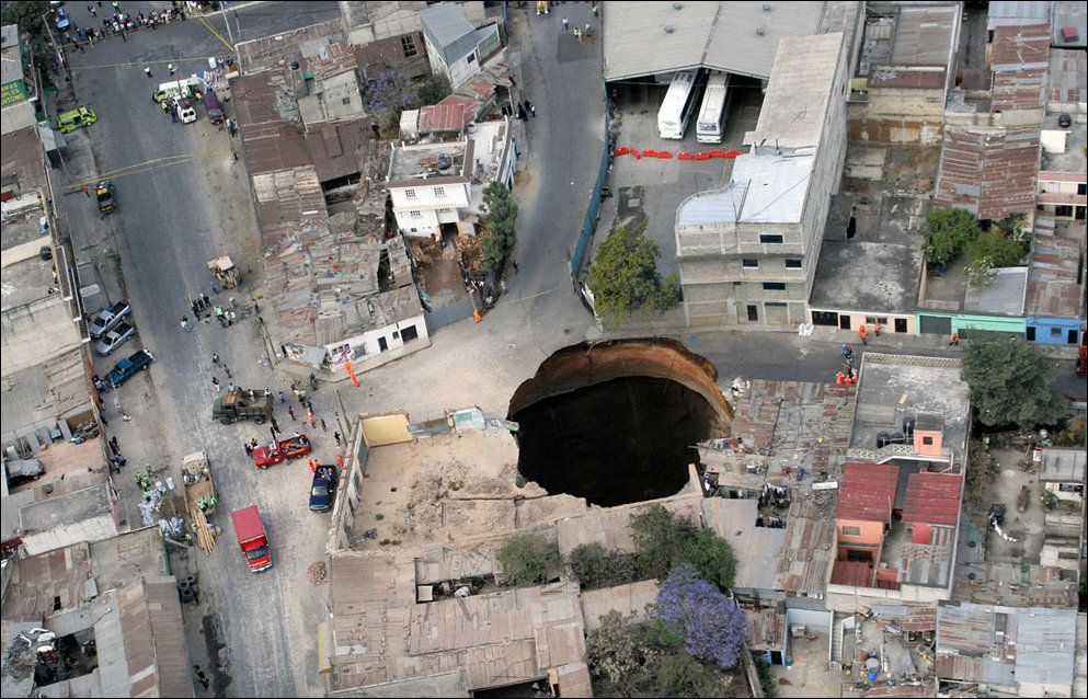 Гватемала Жители города Гватемала слышали странные грохоты в течение нескольких недель, но не понимали, что происходит. Затем, в конце февраля 2007 года, почти идеальный круг земли провалился мгновенно. Удивительно, насколько аккуратной получилась дыра. Два человека погибли и более 1000 пришлось эвакуировать; воронка образовалась в результате проржавевшей канализации глубоко под поверхностью (по-видимому, запах, исходящий из отверстия, был невыносимым). Воронки вызваны изменением геологических условий или неспособностью поддерживать стареющие подземные трубы и канализационные системы, но общим фактором в обоих случаях обычно является вода. Грунт, подстилаемый карбонатной породой-например, известняком — наиболее подвержен потоплению, так как коренная порода разрушается при многократном воздействии воды.