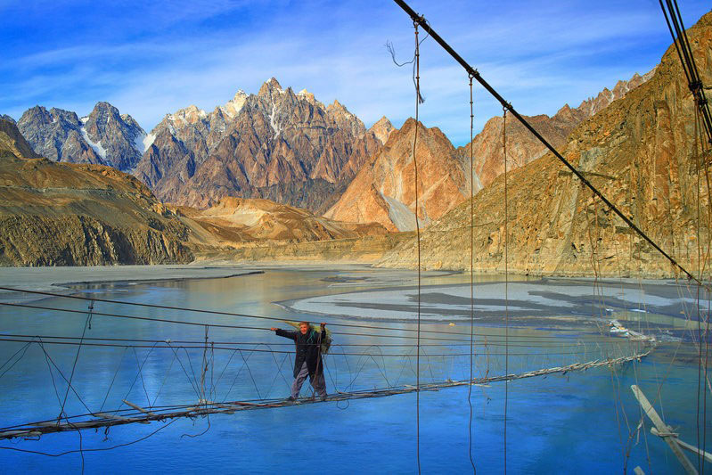 Висячий Мост Хусаини, Пакистан Висячий мост Хуссейни на севере Пакистана известен как самый опасный мост в мире и самый старый мост в Пакистане. Длинный и неухоженный мост пересекает озеро Борит в верхней Хунзе, состоит из деревянных досок и огромных щелей между ними. Это один из самых опасных подвесных пешеходных мостов в мире, и для того, чтобы пересечь его без страха, требуется большое мужество.