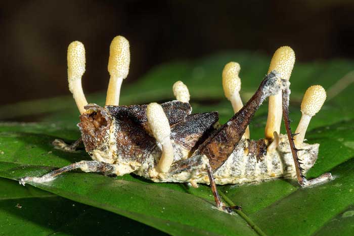 Ophiocordyceps unilateralis — это гриб, который живет в муравьях-древоточцах, обитающих в тропических лесах таких стран, как Бразилия и Таиланд. После того, как споры гриба заражают экзоскелет муравья, начинается процесс зомбирования. Гриб будет получать питательные вещества от муравья, выращивая зародышевую трубку и гифы по всей мышечной сети муравья. По мере роста он медленно заполняет тело и голову жертвы, что приводит к истощению мышц. Через три недели муравей будет находиться под контролем гриба, что приводит к ненормальному поведению. Самый распространенный из них-проводить меньше времени в колонии и бродить за пределами собственных гнезд, превращаясь в животных-зомби. Затем гриб прикажет муравью забраться на растение на высоте около 25 сантиметров над землей. Согласно исследованию, этот уровень высоты обеспечивает правильную влажность и температуру для роста гриба. В то же время это происходит только в полдень, и объяснение этому остается неизвестным. Когда муравей достигает высоты, гриб выделяет вещество, которое разрушает мышцы челюсти муравья. Это приводит к “застывшей челюсти”, муравей будет плотно кусать лист или веточку, не отпуская. Затем гриб использует яд, чтобы убить муравья. После смерти из затылка муравья появляется длинный стебель гриба, наполненный спорами. Когда гриб созревает, его споры распространяются на близлежащую почву и растения, которые заражают следующих жертв. Читайте также: